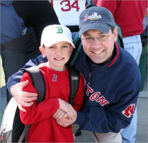 There are hundreds of songs about Christmas, but not one about the best holiday of the year: Opening Day. So the weekend before the Red Sox’ 2008 home opener, I sat down and wrote a song about Opening Day (lyrics below). On Sunday night, after my kids were all in bed, I recorded it in my basement onto my Mac laptop using GarageBand software. Five tracks: two acoustic guitars and three vocals. Less than 36 hours after being recorded, the song made its radio debut on the Loren and Wally morning show on WROR (105.7 FM).